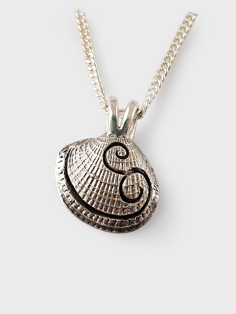 Hand finished stylised hand carved Cockle shell and korus (scroll) pendant.