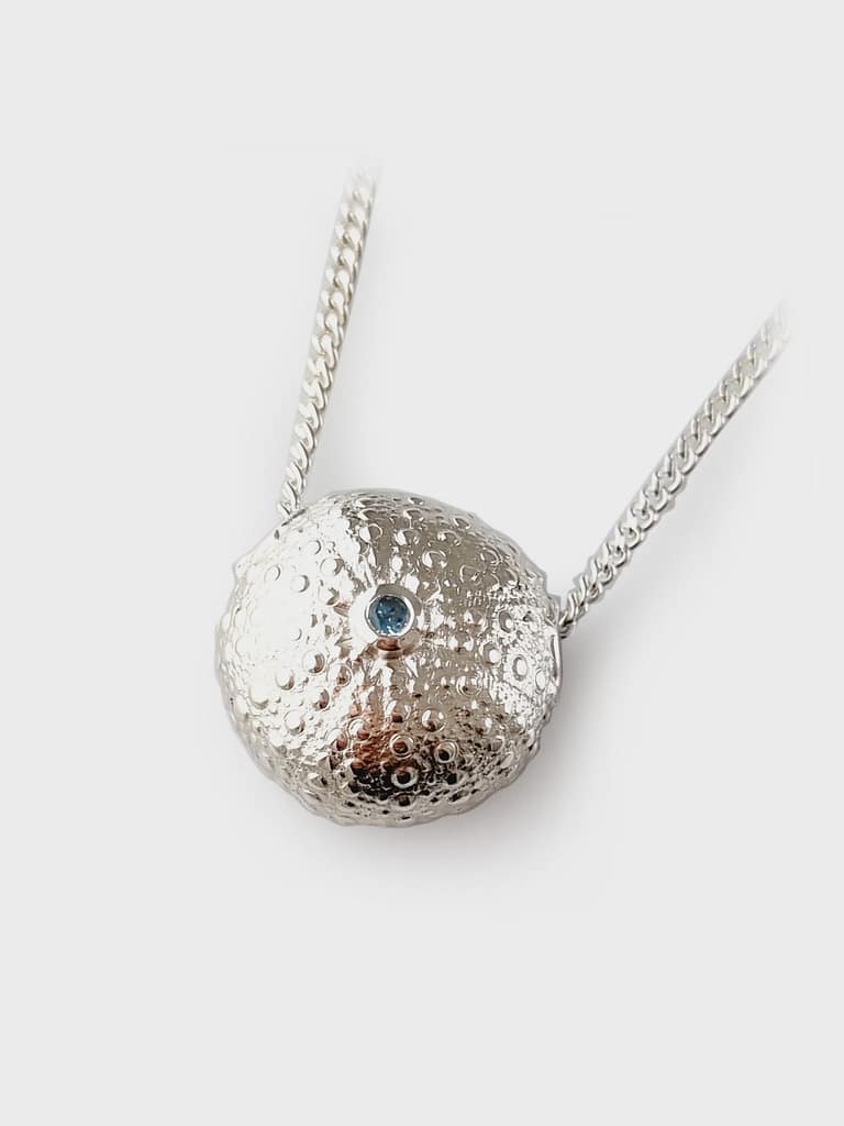 Hand finished Sterling Silver ‘ Kina (sea urchin) pendant set with a Swiss blue Topaz center .