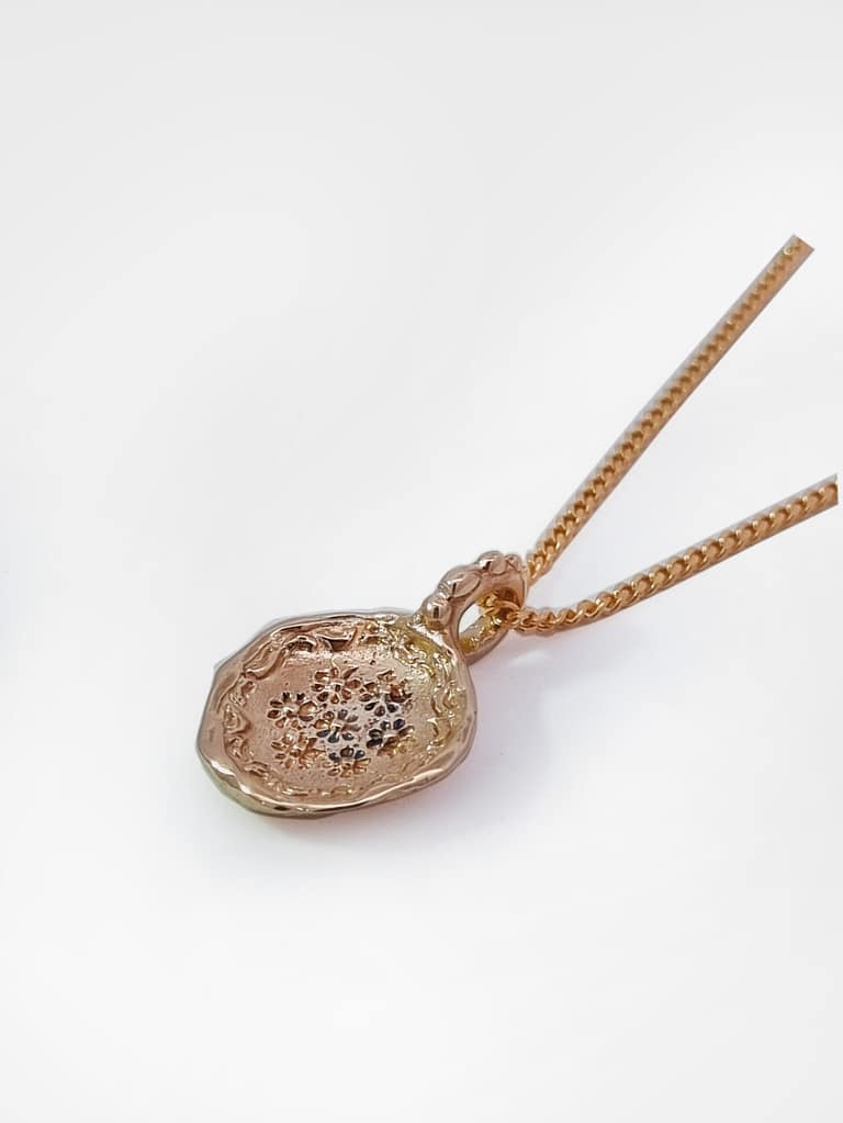 Hand finished 9ct YELLOW Gold stylised Paisley Disc pendant . Recessed disc with embossed floral motief.