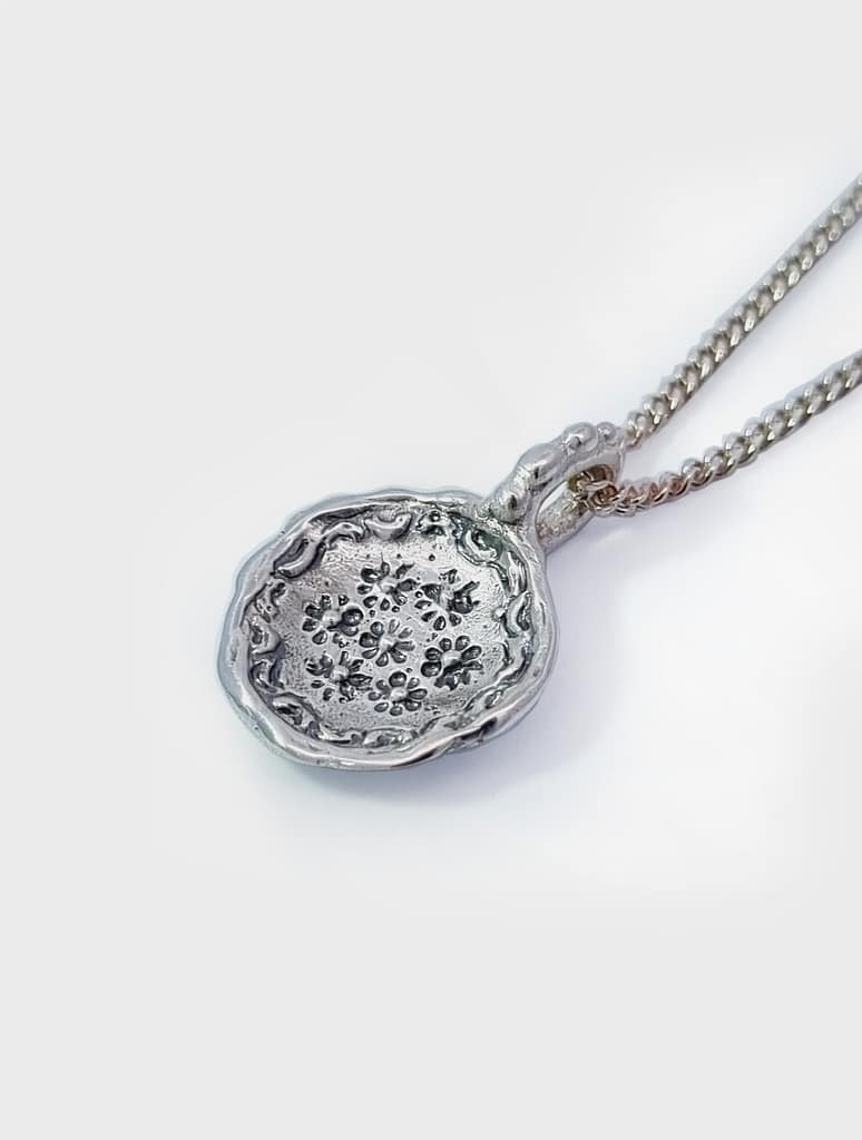 Hand finished Sterling Silver stylised Paisley Disc pendant . Recessed disc with embossed floral motief.