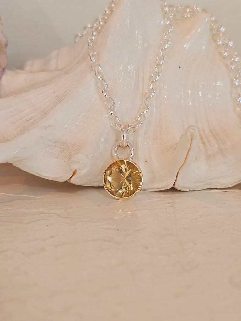Handmade Sterling Silver collet style pendant with 10.5mm round faceted AA grade yellow honey colored Citrine.