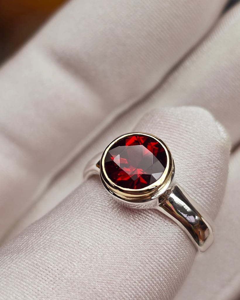 Rub over set 8mm round AAA grade African GARNET in a 9ct yellow Gold bezel top.