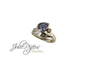 Husband to be chose the ring & the stone . The stone is a stunning purplish blue Ceylonese Sapphire from Sri Lanka . It has lots of sparkle & the the azure tones looking stunning on his beautiful Brazilian wife to be . Set in white Gold & a sprinkle of Diamonds thrown in for good measure it’s a true piece of jewelleryART they will treasure forever